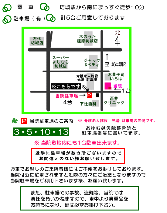 アクセス当院までのアクセス方法です。電 車坊城駅から南にまっすぐ徒歩10分.駐車場 ( 有 )計5台ご用意しております